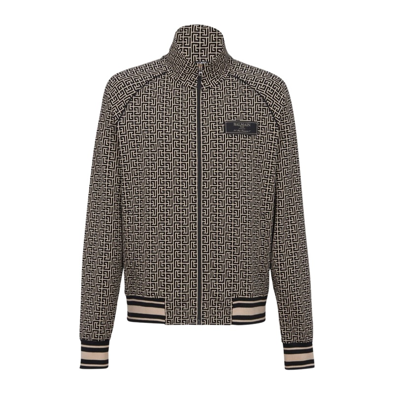Letters combination jacquard pattern logo applique, stripe detail, front zipper closure, long raglan sleeves, ribbed hem and edges, two side piping pockets.