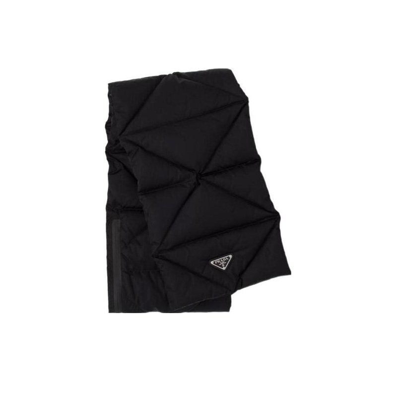 Logo scarf, quilted design, metal triangular logo decoration, letter logo.