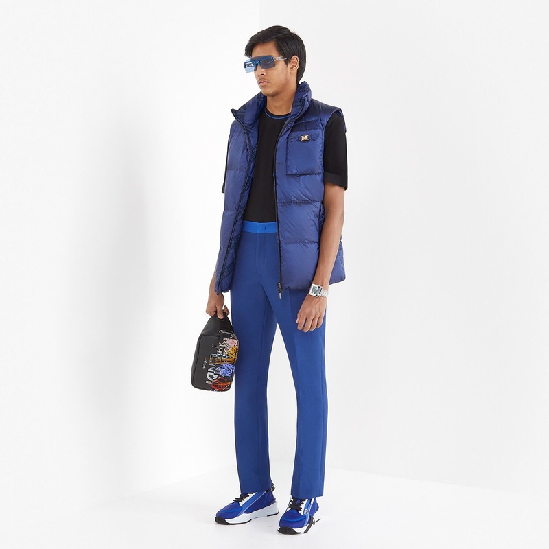 Vest type down jacket, standing collar, quilting design, zipper opening and closing.