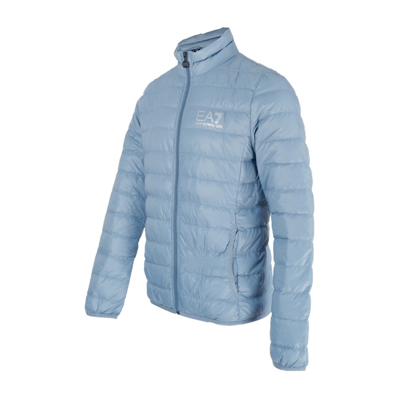 Logo details down jacket, long sleeves, standing collar, front zipper opening and closing.