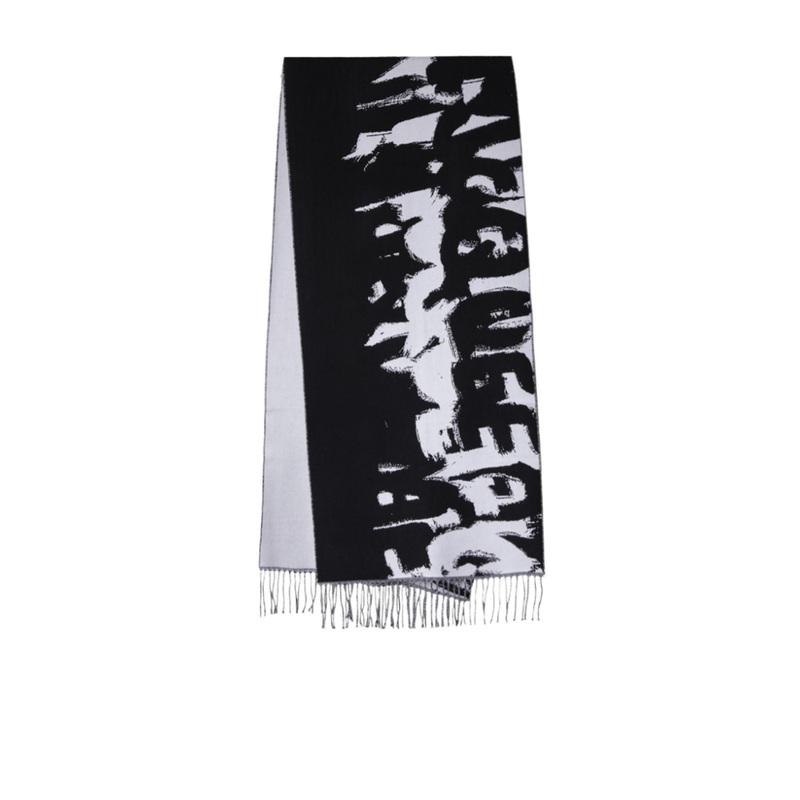 Black, ivory white, wool, square, graffiti printing, fringed.